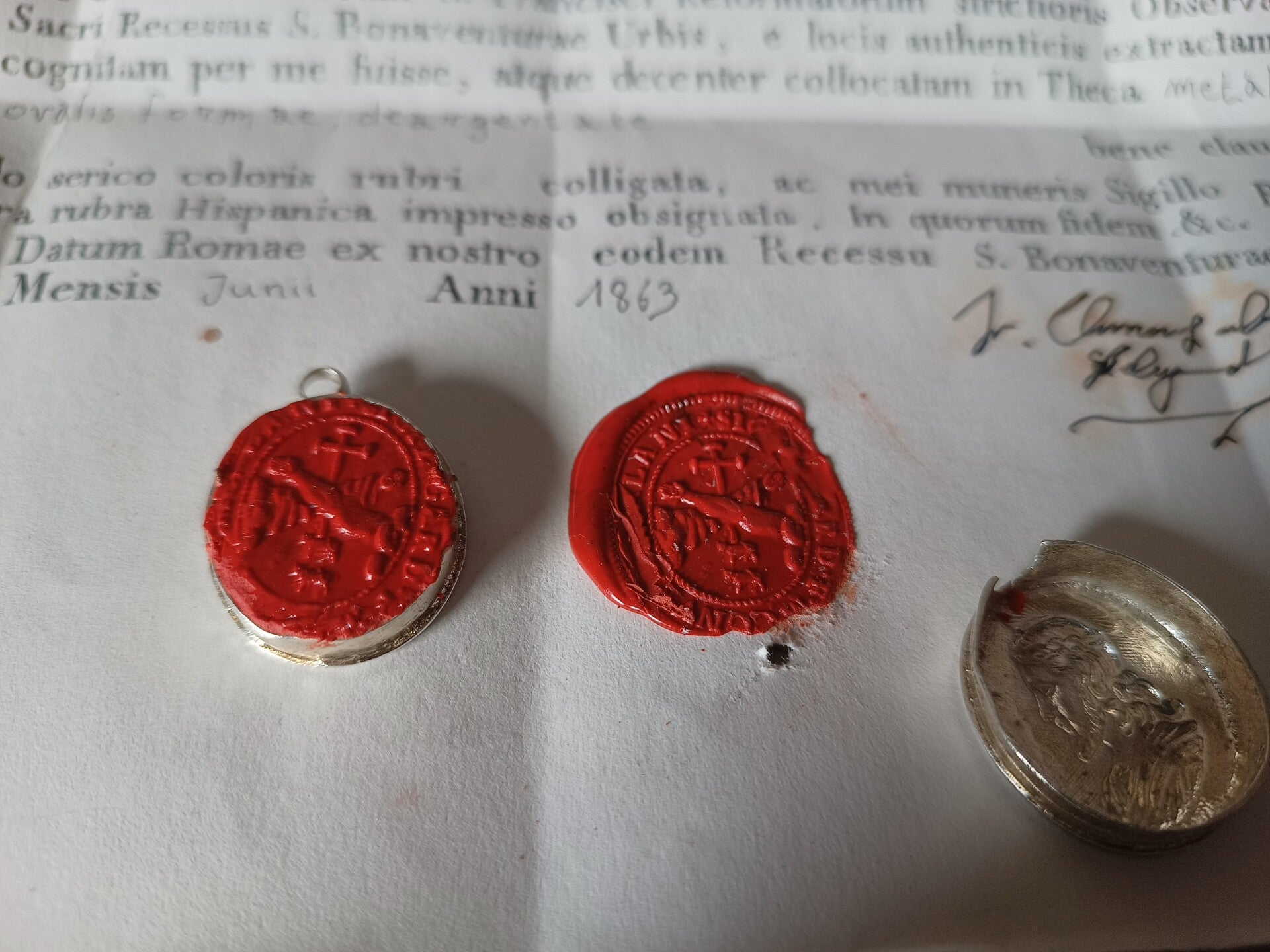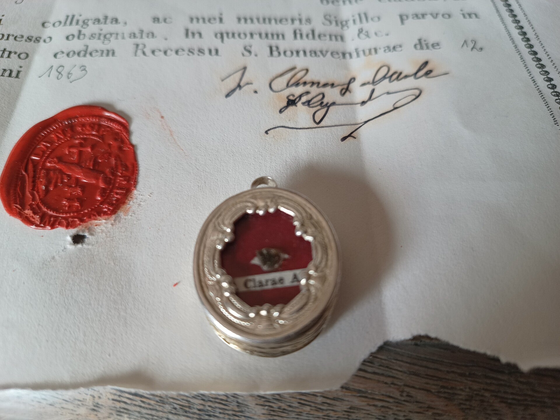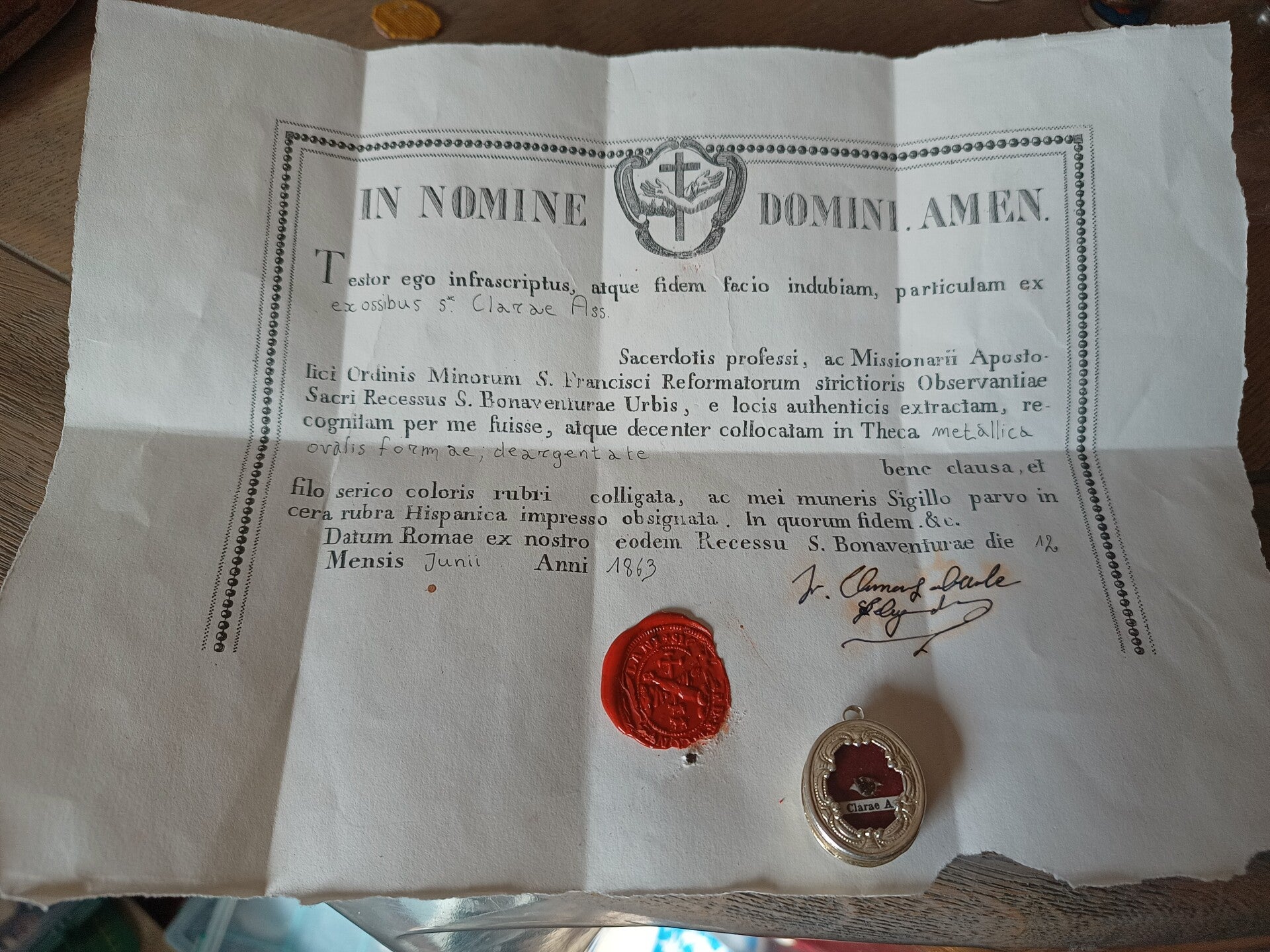 This is a really nice relic of saint claire, kept in goodcondition because the paper has not browned a lot, however we think that at one point in time it came into contact with moisture or a place with not so good insulation since the signatures clearly bear traces of moisture