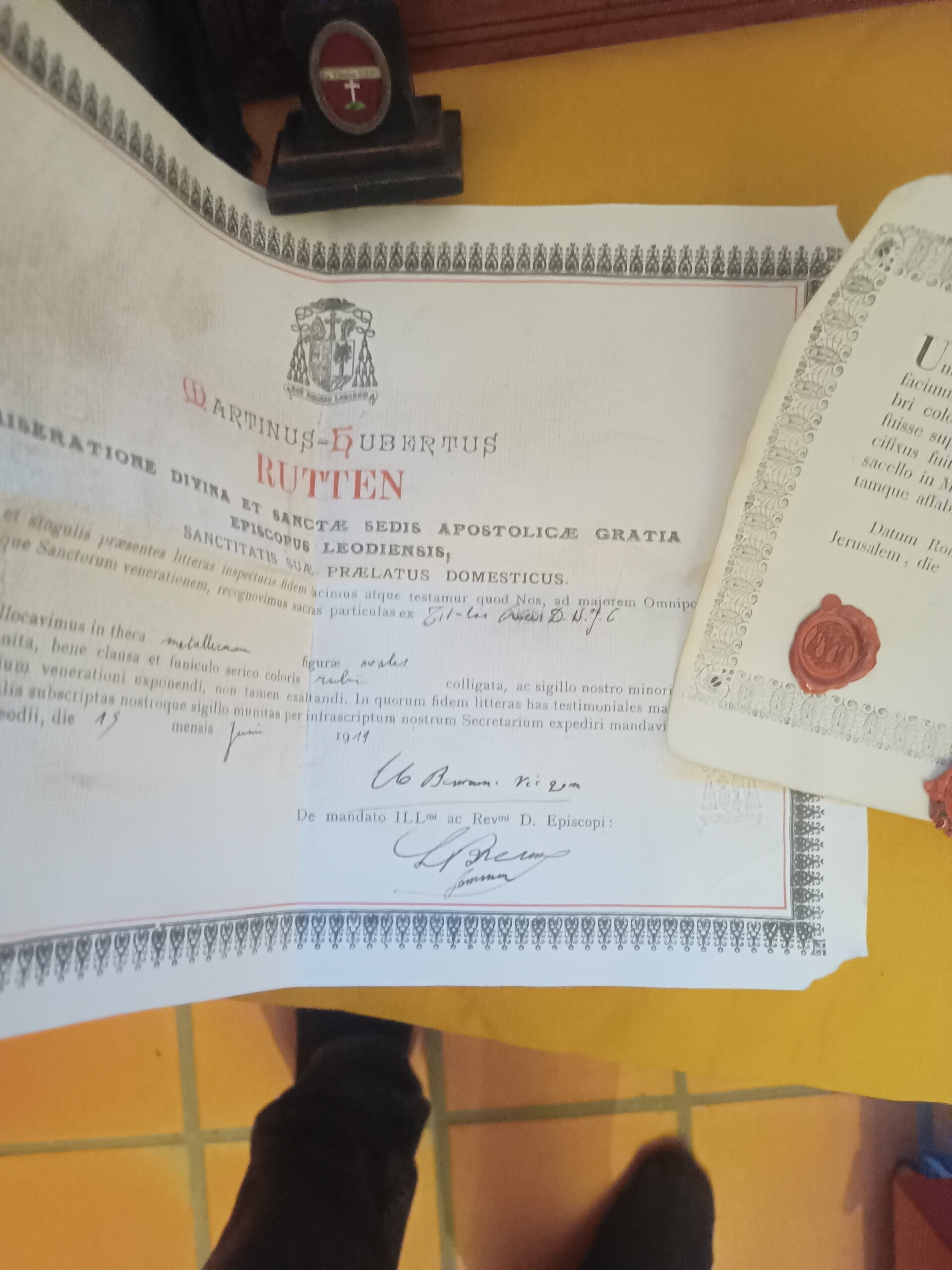 title of the true cross comes with it's certificate - theca with the title was added to a small cross at a later date, also a lot of satining including a darker stain on the spot where titulus crucis was written